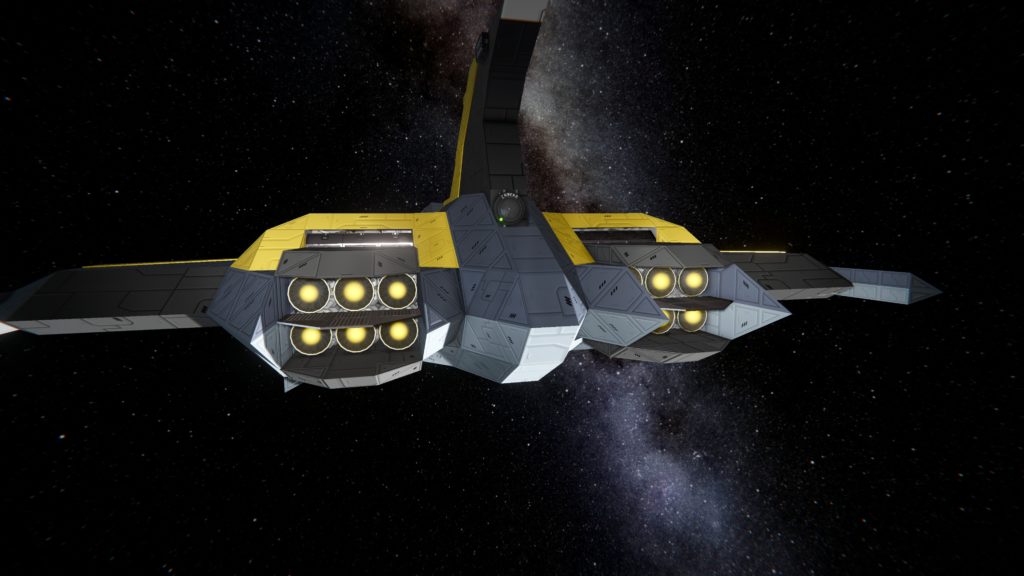 All of the internal thrusters are hydrogen based, so I didn’t need a lot of them to get the thing moving. I just needed 2 blocks of clearance per thruster for safe operation. Sadly, ion thrusters are so frustrating to use that they border on being useless for my builds. They don’t need conveyors or hydrogen storage to operation, just power, but their output’s so sluggish that you need an insane number of them. They’re better as cosmetics on small combat ships.