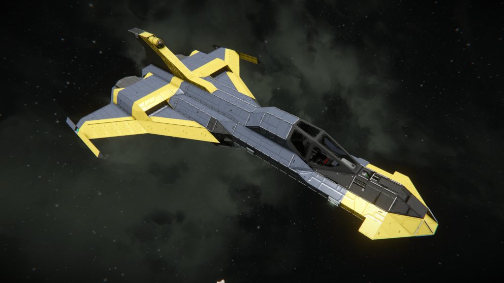 A lot of other considerations have gotten sidelined for aesthetics, so the Cosmo Messer is heavier than it looks; extra plating to pretty up the default paint scheme and so on. There are some areas inside I left completely empty to try to balance this out, but in order to hover on Pertam I needed nine hydrogen thrusters. That’s not a huge number, but I feel like any less than that and the ship would be dangerously sluggish at low altitudes. Either way she flies. The range still isn’t great, but there are a couple of free programmable blocks left that might be able to hold a ‘fuel management’ script or something.